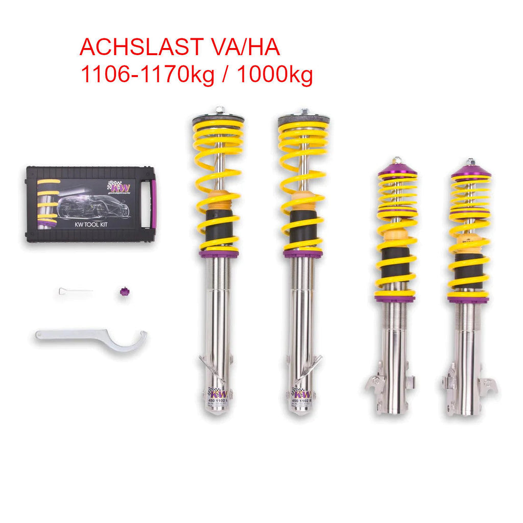 Unser Einstiegsmodell für mehr Fahrspaß durch eine ansprechende und individuell einstellbare Tieferlegung ist das KW V1 Gewindefahrwerk in der KW typischen "inox-line". Durch seine hochwertige Verarbeitung, der konsequenten Nutzung von Federbeinen aus rostfreiem Edelstahl, korrosionsbeständigen Federn sowie aufeinander abgestimmten Komponenten steht es für langjährigen Fahrspaß – nicht nur ein Autoleben lang.